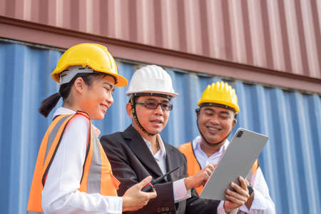 Container Shipping Logistics Engineering of Import/Export Transportation Industry, Transport Engineers Teamwork Controlling Management Containers Together at Port Ship Loading Dock. Business Team