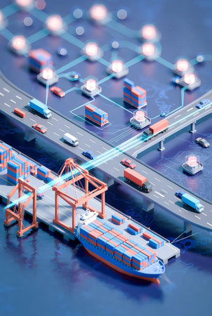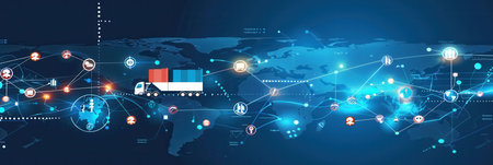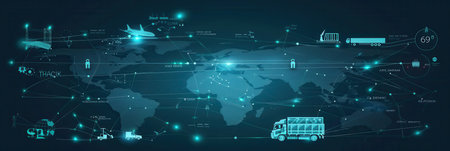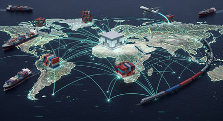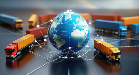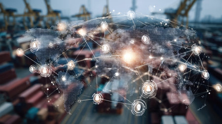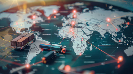 Ports, warehouses, and transport vehicles linked on a digital logistics map of the world