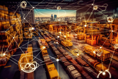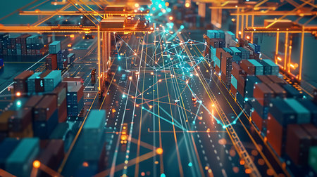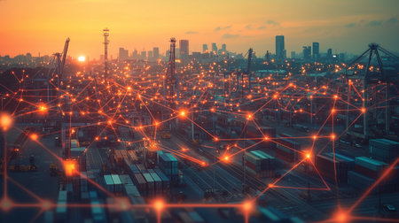 A busy urban port filled with cargo containers during sunset. Bright connections symbolize digital networking, highlighting the merging of technology and industry in the skyline.