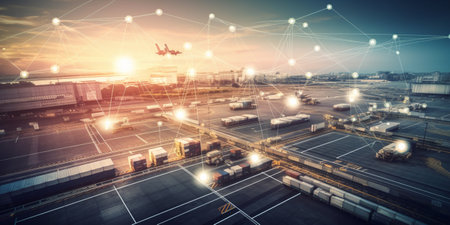 Captivating aerial view of a busy shipping port at sunset, highlighting containers and digital network connections that represent modern logistics and supply chain integration.
