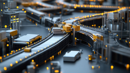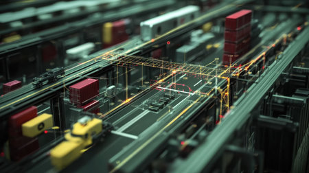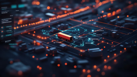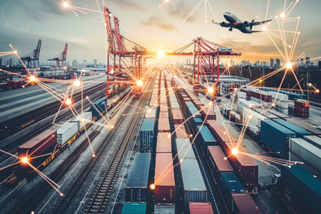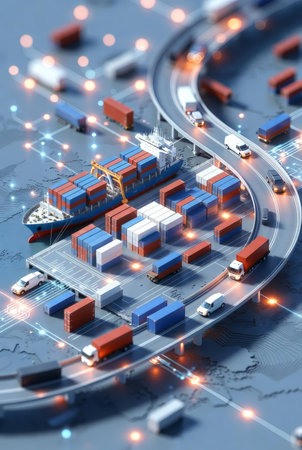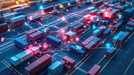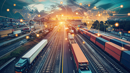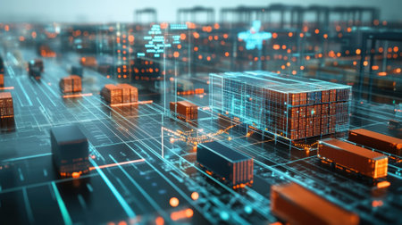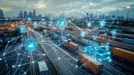A modern freight transportation system illustrating advanced logistics technology and digital connectivity, showcasing the intricate network of containers and vehicles in a bustling urban landscape.