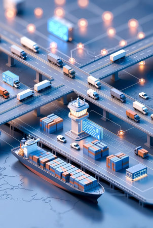 Centralized logistics hub with icons and data overlays representing efficient transportation management systems