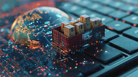 Miniature freight container loaded with boxes sits atop a computer keyboard. A stylized globe with intricate connecting lines is visible in the background, suggesting a global network. The image is designed to showcase digital global commerce through transportation.