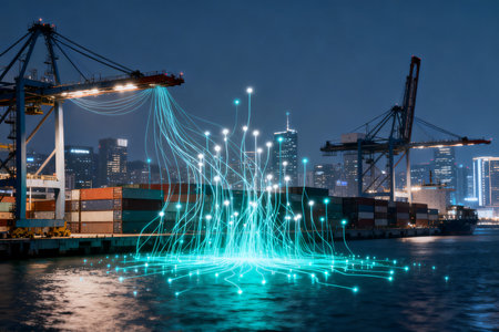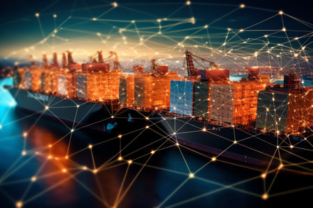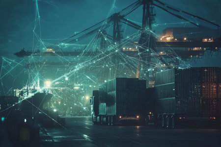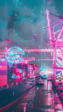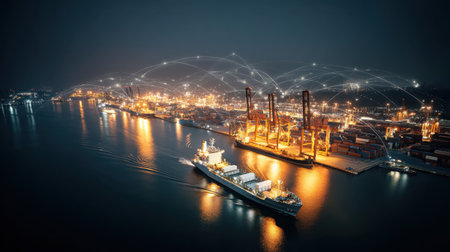 A stunning nighttime view of a modern shipping port showcasing a cargo ship and illuminated cranes, reflecting a vibrant digital network.