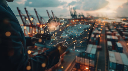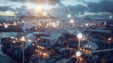 A digital representation of a global supply chain network overlaid on a busy shipping port, showcasing interconnectedness and modern logistics management.