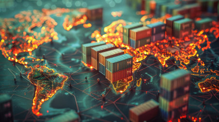 Vibrant digital visualization of global trade featuring shipping containers on a world map. This image illustrates connections in logistics and commerce.