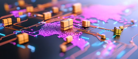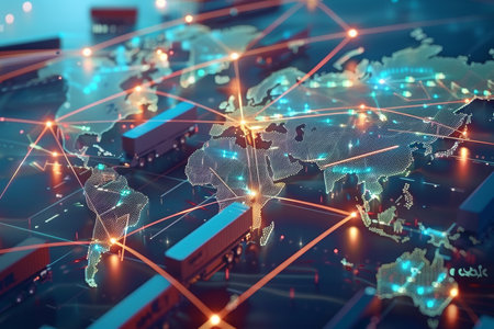 A stylized map shows illuminated connections across continents, highlighting global trade and communication networks in a modern, tech-inspired design.
