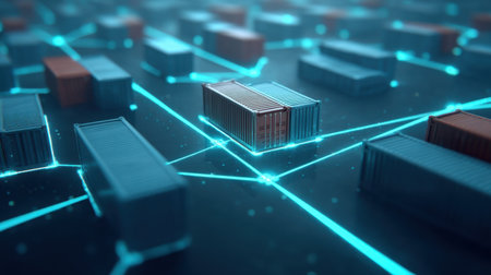 This image showcases a futuristic concept of logistics, featuring shipping containers interconnected by glowing digital data lines, illustrating abstract cargo transport networks.