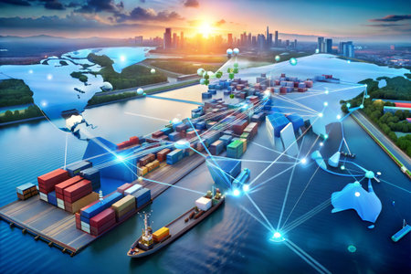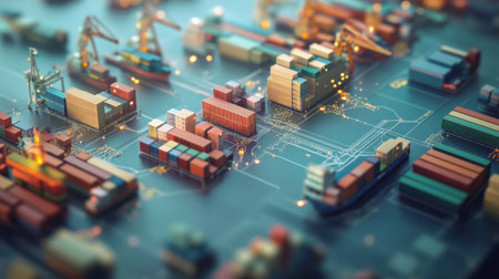 A captivating visual showcasing the global trade network, featuring shipping containers and ports connected by a web of digital links, symbolizing modern logistics and international commerce.