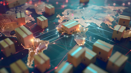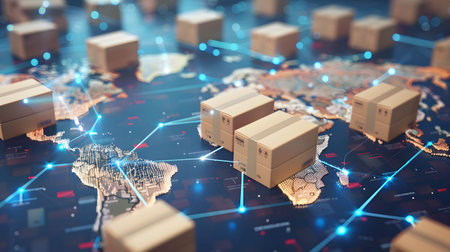 A global shipping network illustrated with cardboard boxes connected by glowing lines across a world map, symbolizing international trade.