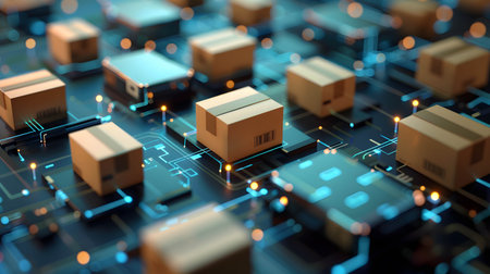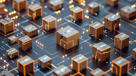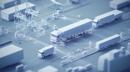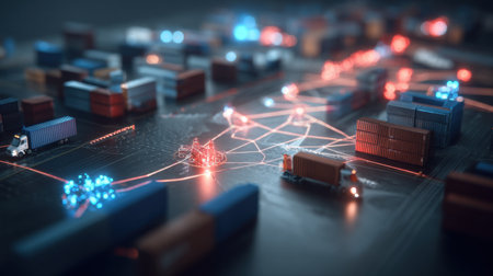 This digital artwork captures a futuristic logistics scene featuring trucks and cargo containers connected through glowing pathways, representing advanced supply chain dynamics.