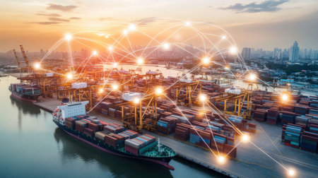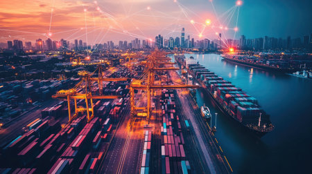 A stunning aerial view of a busy container port during sunset, showcasing cargo ships and vibrant city skyline with digital network lines symbolizing connectivity.