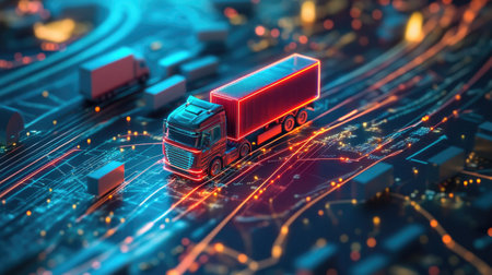 A semi-truck advances through a digitized logistic network, illustrating the integration of AI in optimizing global supply chains.
