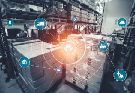 Smart warehouse management system with innovative internet of things technology to identify package picking and delivery . Future concept of supply chain and logistic network business .