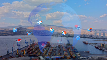 Cargo shipping for import and export utilizes container ships in the open sea, exemplifying smart industrial and logistics solutions
