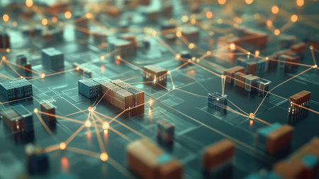 This image captures a futuristic view of cargo containers interconnected in a digital landscape, symbolizing the modern complexities of global logistics and supply chain management.