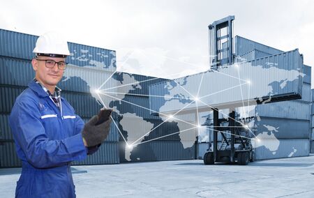 Double exposure of Engineer or Technician man working with tablet computer and Logistics network connection concept