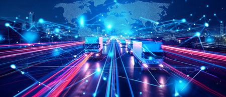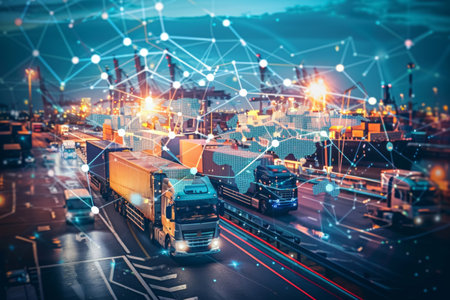 This image captures a bustling nighttime logistics hub, featuring trucks surrounded by digital network connections, highlighting modern transportation technology and efficiency.
