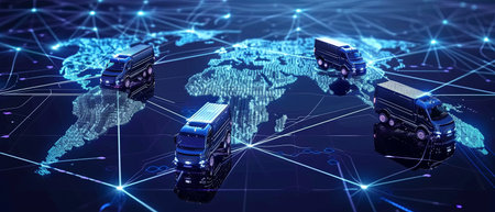 A digital representation of a global logistics network, featuring a glowing Earth surrounded by various trucks and connected by lines, isolated on white background.