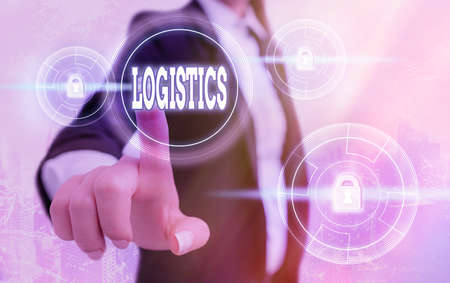 Text sign showing Logistics. Business photo showcasing coordinating in detail a complex activity involving several Graphics padlock for web data information security application system