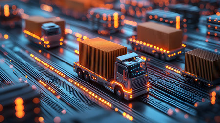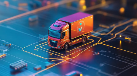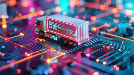 A vivid representation of logistics and transportation featuring a toy truck set against a digital circuit backdrop, illustrating the intersection of technology and delivery services.