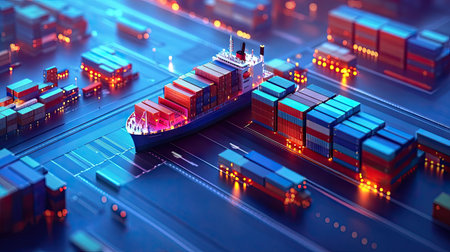Advanced transportation and logistics growth. Container cargo ships and trucks within a smart distribution network, highlighting industrial efficiency and innovation.