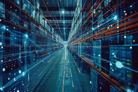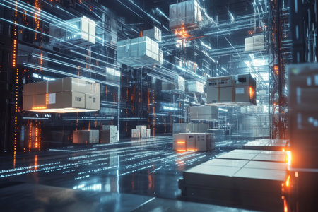Futuristic warehouse floating shelves and digital data redefining cargo movement and efficiency