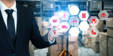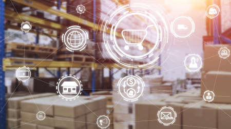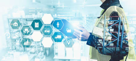 Smart warehouse management system with innovative internet of things technology to identify package picking and delivery . Future concept of supply chain and logistic network business .
