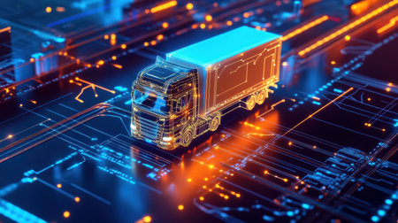 3d rendering of truck on circuit board background with bokeh lights