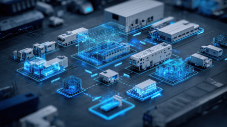 Explore a digitalized industrial landscape featuring connected vehicles and modern infrastructure. This image showcases innovation and technology in a vibrant networked environment.