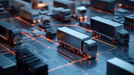 This digital artwork captures a futuristic logistics scene featuring trucks and cargo containers connected through glowing pathways, representing advanced supply chain dynamics.