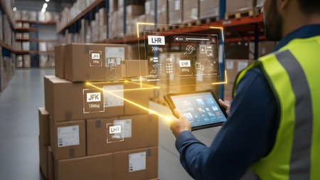 Logistics worker uses tablet with AR overlay for package tracking in warehouse Clear details and ...