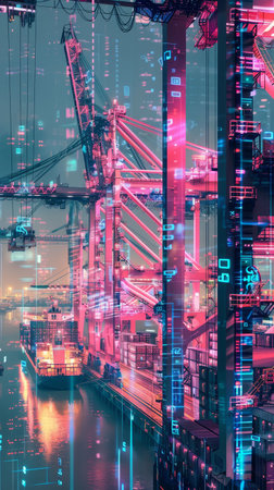 Smart port with holographic interfaces, engineers monitoring cargo, Soft pink and blue neon, Futuristic, Photo collage