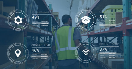 Walking worker wearing vest navigating warehouse aisle with racks, bins or boxes using data overlay. Industrial, logistics, inventory, automation, efficiency, organization, productivity
