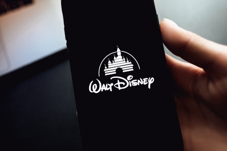 Hand holding the iPhone X with Disney logo on the screen. Copy space.