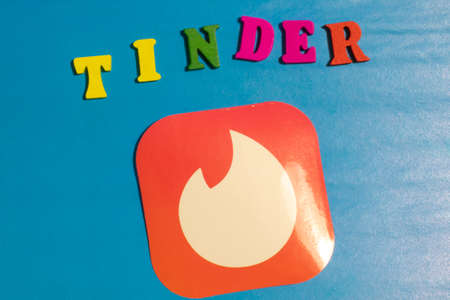 Los Angeles, California, USA - 25 January 2020: Tinder app logo close-up on blue background, Illustrative Editorial.