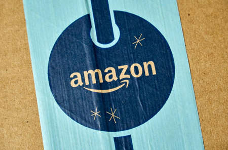 MONTREAL, CANADA - JANUARY 1, 2019: Amazon Prime holiday package with logo. Amazon, is an american technology company focusing on e commerce and cloud computing company,based in Seattle, WA