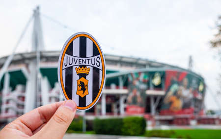 August 30, 2021, Turin, Italy. The emblem of the football club Juventus on the background of the modern stadium.