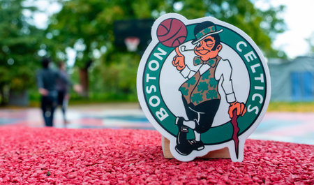 September 15, 2021, Boston, USA, The emblem of the Boston Celtics basketball club on the sports ground.