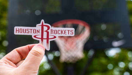 September 15, 2021, Houston, USA, A man holds the emblem of the Houston Rockets basketball club in his hand on the sports field.