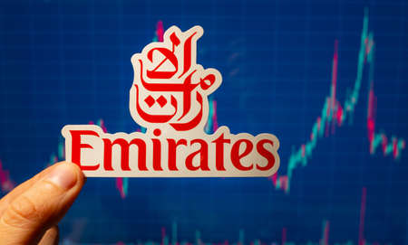 November 10, 2021 Dumbai, UAE. The emblem of the Emirates airline against the background of a stock price chart.