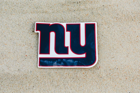 September 15, 2021, Moscow, Russia. The emblem of the New York Giants football club on the sand of the beach.