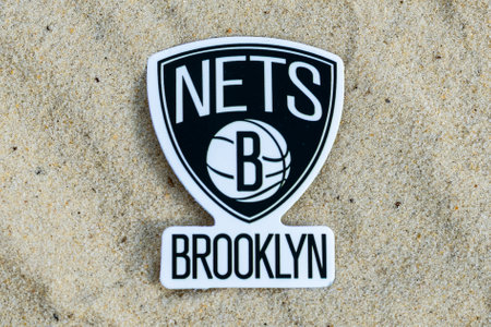 September 15, 2021, Moscow, Russia. The emblem of the Brooklyn Nets basketball club on the sand of the beach.