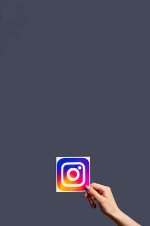Kharkiv, Ukraine - June 05, 2020: Instagram logo. Digital marketing. Social media. Woman hand showing application icon isolated on dark purple copy space background.