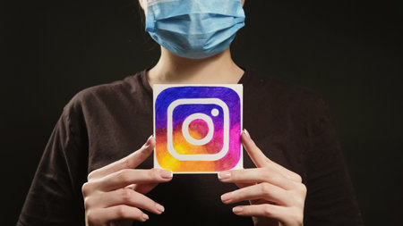 Kharkiv, Ukraine - May 12, 2020: Covid social media. Distance Internet communication. Unrecognizable woman wearing face mask holding Instagram icon on dark black free space.