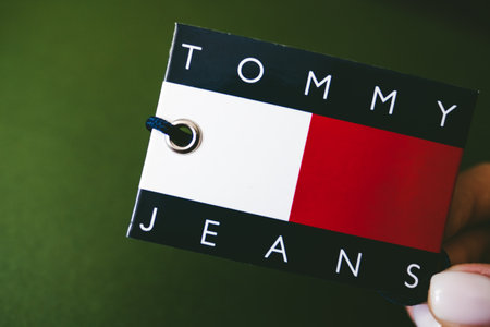 Closeup of Tommy Hilfiger label on green background. Hilfiger Denim. Tommy Hilfiger detail.