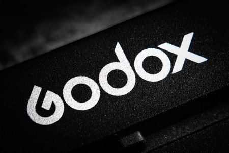 GODOX label editorial photo. Close-up logo trademark. Almaty, Kazakhstan - January 13, 2022