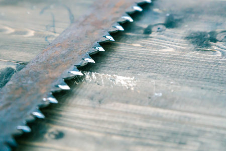 saw prongs old and rusty close-up on wooden background