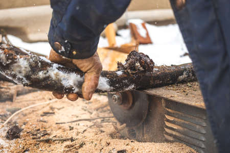 Man cutting wood using stationary circular saw outdoors in winter for kindling close-up