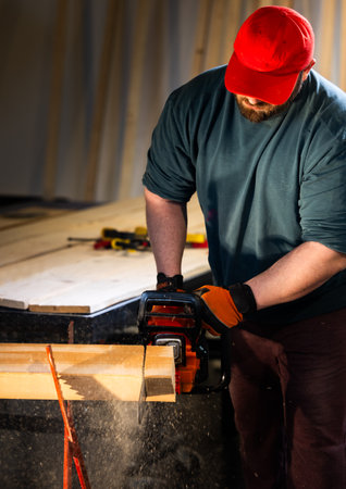 young worker man hand saws with wood